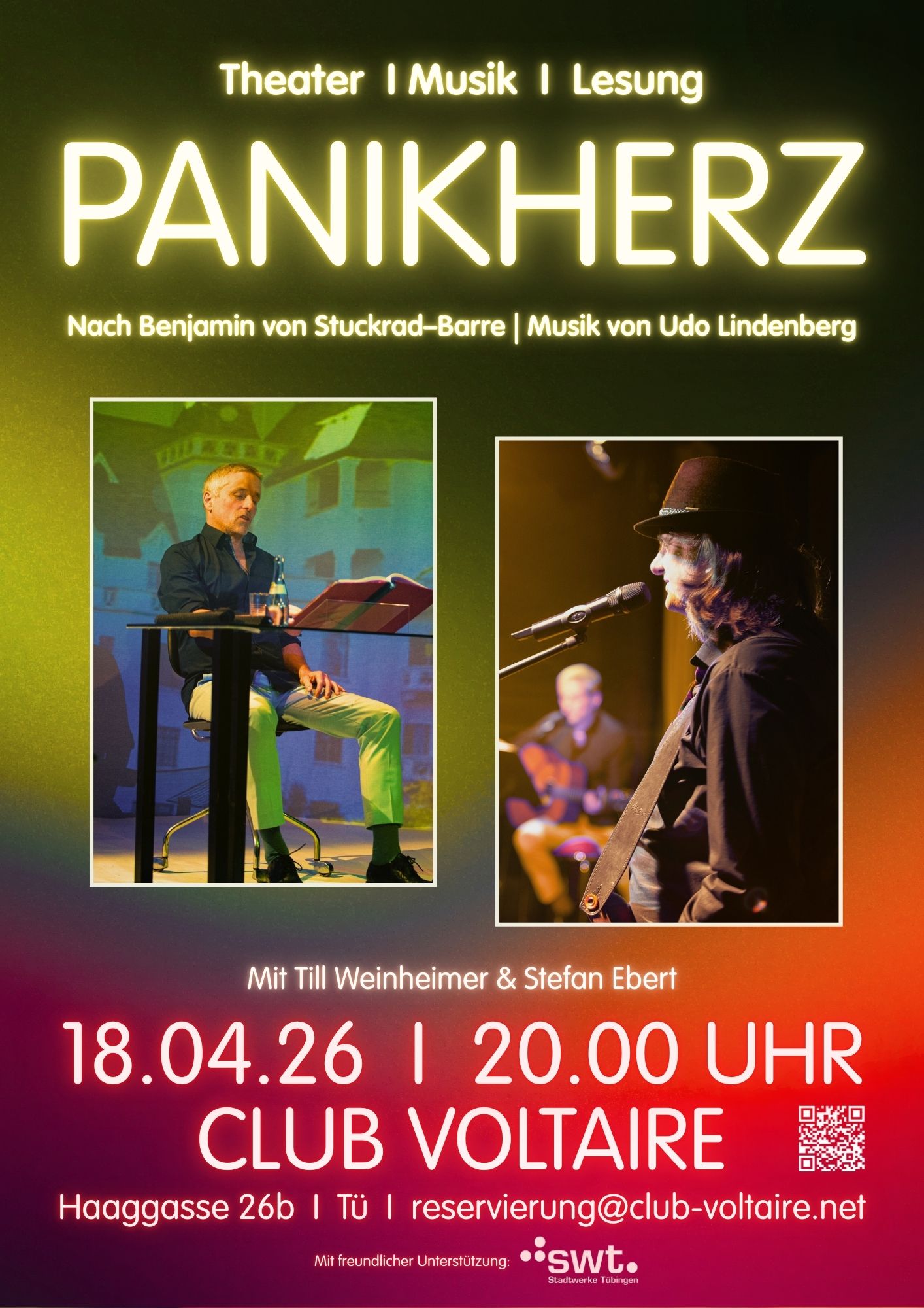Club Voltaire Haaggasse 26b, Tübingen, DeutschlandMusikalischer Seelentrip nach Stuckrad-Barre / Musik von Udo Lindenberg Es spielen: Till Weinheimer, Stefan Ebert / Inszenierung: Joerg Steve Mohr Der gefeierte Autor und provokante Chronist des menschlichen Daseins, Benjamin von Stuckrad-Barre öffnet sein innerstes Ich und präsentiert eine verzweifelte und doch faszinierende Odyssee durch die Höhen und Tiefen des Ruhms, der Drogenabhängigkeit und der unstillbaren Sehnsucht Weiterlesen …